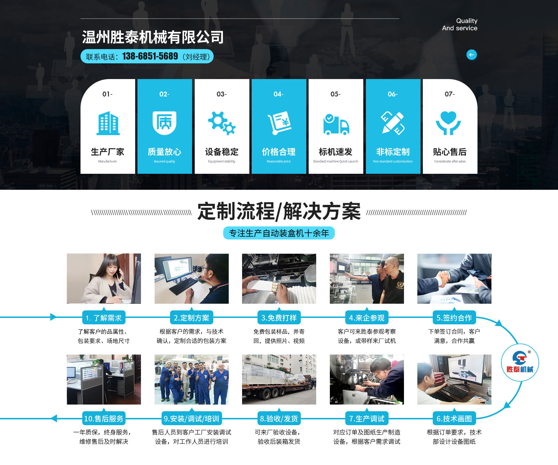 溫州勝泰機(jī)械有限公司位于東海之濱, 坐落于"包裝機(jī)械城"-溫州市。集研發(fā)、生產(chǎn)、經(jīng)貿(mào)于一體的現(xiàn)代化科技型企業(yè),是國(guó)家高新技術(shù)企業(yè),通過了CE認(rèn)證、IS09001質(zhì)量體系認(rèn)證,并獲得了多項(xiàng)專利。從事盒裝紙包裝設(shè)備10余年,具有先進(jìn)的技術(shù)力量和生產(chǎn)工藝,制造經(jīng)驗(yàn)豐富、產(chǎn)品質(zhì)量可靠、價(jià)格合理、能為廣大客戶提供設(shè)備、技術(shù)、原材料供應(yīng)全方位服務(wù),幫助客戶打造專業(yè)化、智能化、無人化的工業(yè)4.0工廠。